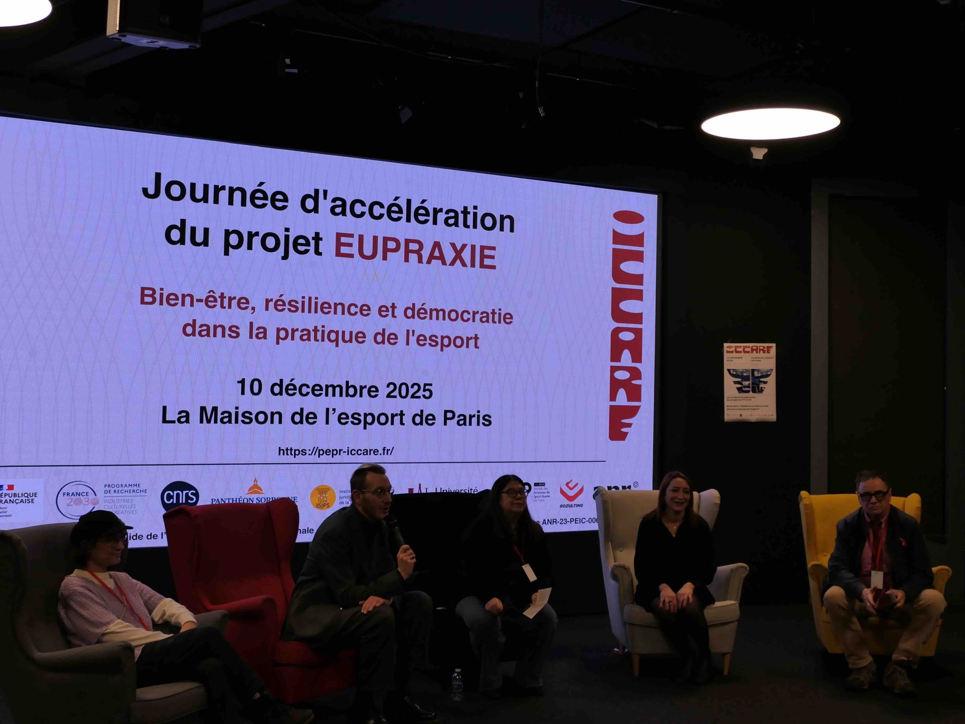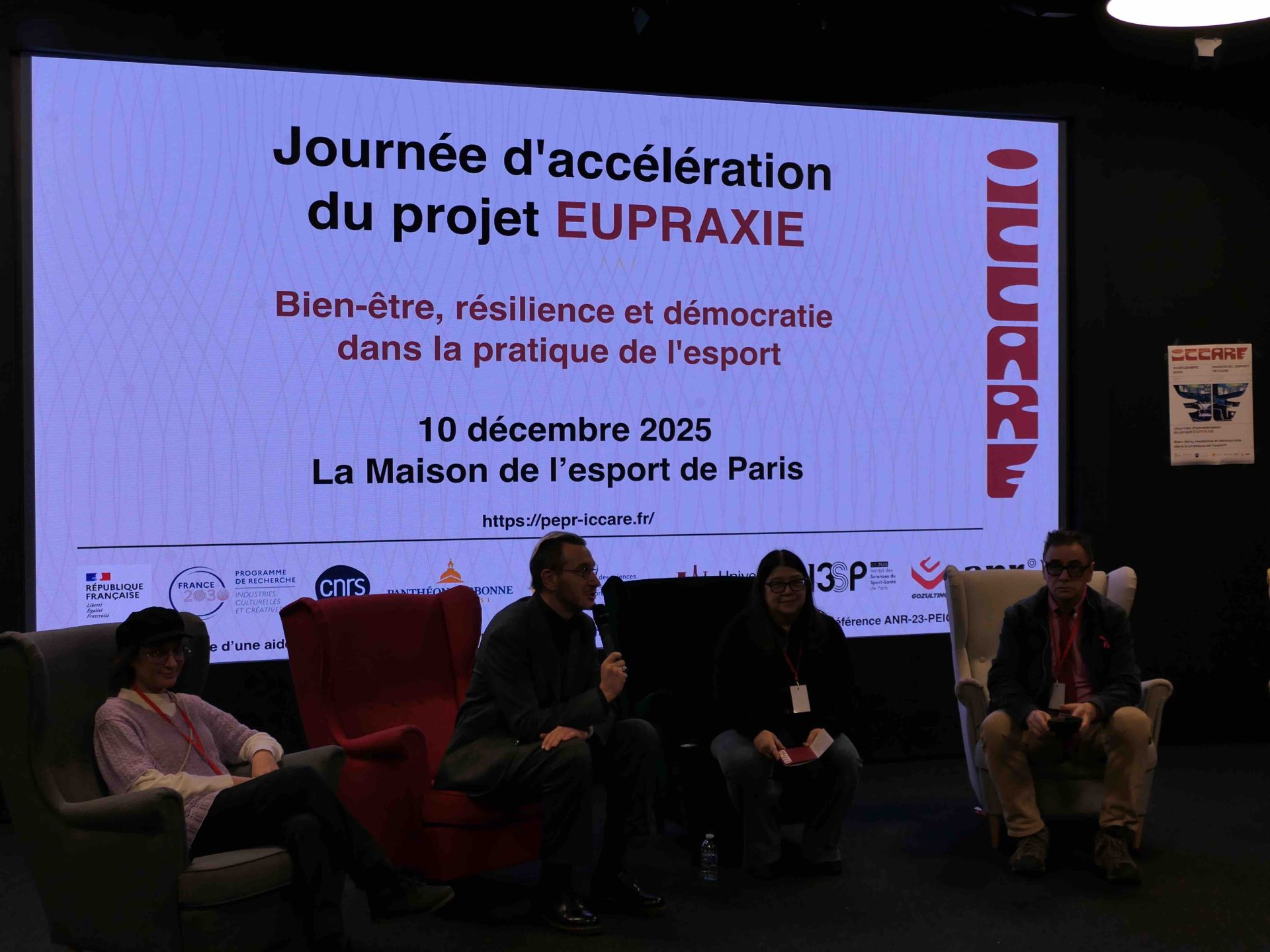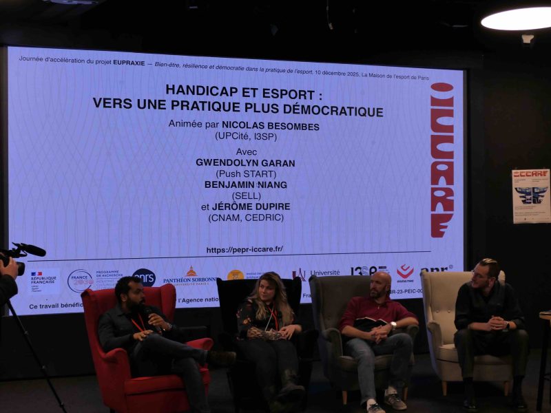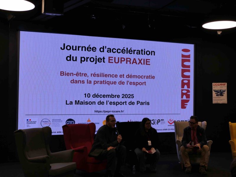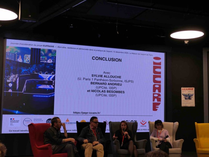 Le projet ciblé EUPRAXIE du programme de recherche (PEPR ICCARE) organise le 10 décembre 2025, sous la direction de Bernard Andrieu et Nicolas Besombes, une journée d'accélération "Bien-être, résilience et démocratie dans la pratique de l'esport", Paris, Maison de l’Esport de Paris (20 rue Soleillet, 75020 — 9h à 18h).