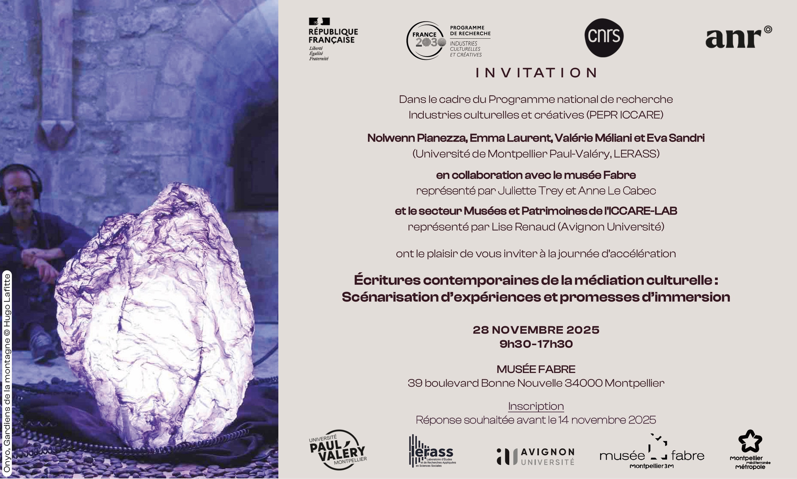 Avec ANNE LE CABEC (musée Fabre), SARAH LABELLE (u. Montpellier Paul-Valéry, LERASS) et AMANDA RUEDA (u. Toulouse Jean-Jaurès, LERASS), co-responsables de l'Axe MOCEN du LERASS et LISE RENAUD (Avignon Université, facilitatrice du secteur Musées et Patrimoines du PEPR ICCARE)