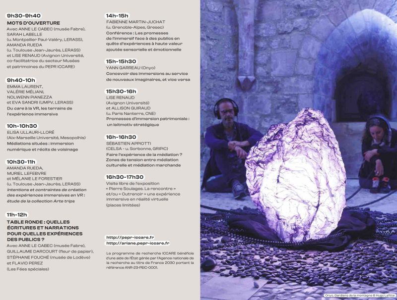 L’offre contemporaine en médiation culturelle propose des expériences à vivre, aventures ou traversées sensibles sur le mode annoncé de l’immersion, visuelle, sonore, sensorielle : films VR, fictions poétiques, balades sonores avec ou sans écran. Qu’elles se déploient en régime numérique ou non, au musée ou en dehors, ces propositions convergent lorsqu’elles prêtent une attention particulière à la mise en récit, à une narrativité dite expressive, selon un processus de scénarisation inspiré du storytelling et/ou du storyliving. À mesure qu’elle désigne un champ de la médiation expérientielle, porté par les ICC montantes de l’immersif, l’offre de visite muséale nous invite à sonder la fabrique de ses écritures médiatiques. Autour de chercheurs et professionnels - musées, artistes, studios, agences - cette journée accueillie par le musée Fabre abordera son épistémologie en chantier, les méthodes, outils et ressorts narratifs identifiés par les concepteurs des dispositifs expérientiels. Elle nous invitera à réfléchir à l’opérativité de ces scénarios au sein de l'espace muséal et des dispositifs proposés, aux intentions des concepteurs en termes de rencontre avec les publics.