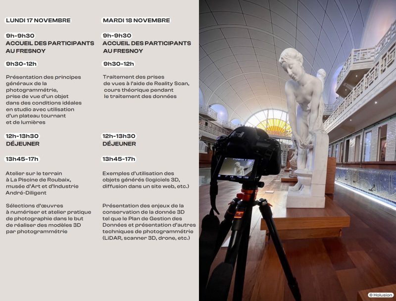 C’est dans cette perspective que se tiendra la formation “Initiation à la photogrammétrie”, animée par Thibault Guillaumont, fondateur et président de Holusion, société lilloise spécialisée dans la conception de dispositifs holographiques et la valorisation 3D du patrimoine. L’équipe partagera son expertise technique et ses retours d’expérience autour des outils, méthodes et usages de la photogrammétrie.