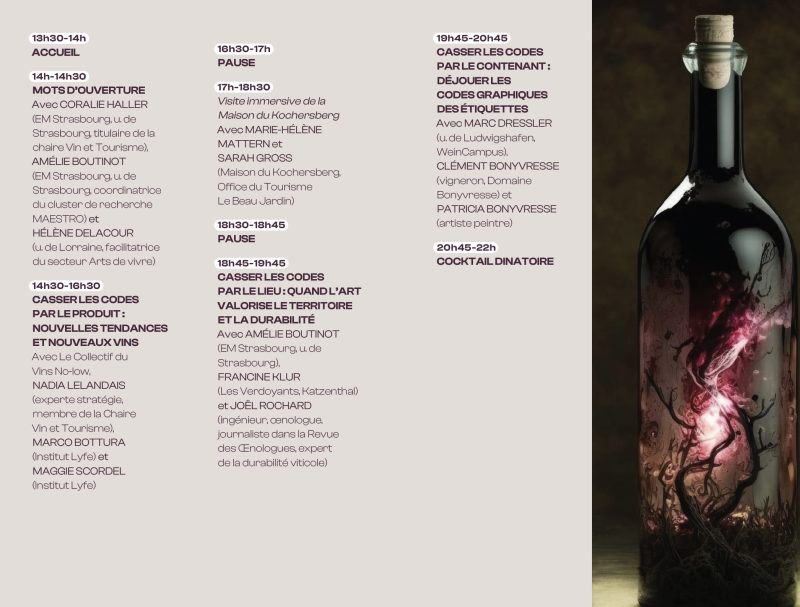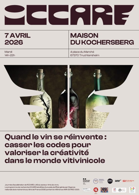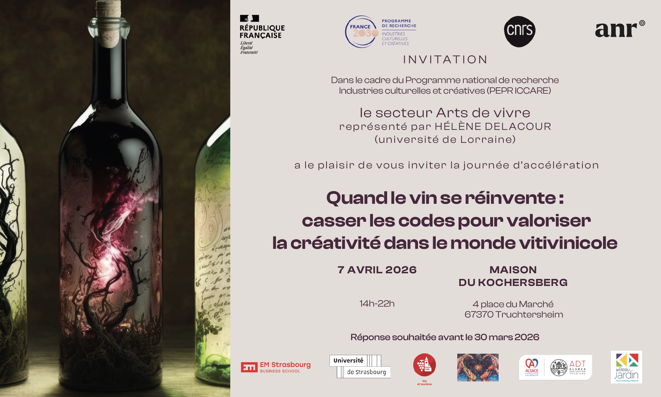 Le secteur Arts de vivre du programme national de recherche industries culturelles et créatives (PEPR ICCARE), l’ADT (Alsace Destination Tourisme), la Chaire Vin et Tourisme et le Cluster de recherche MAESTRO (Management in the Arts, Environment and Society : creaTivity for Real Outcomes) de l’EM Strasbourg, Université de Strasbourg, vous convient à une journée immersive sur la réinvention des codes dans l’industrie vitivinicole.