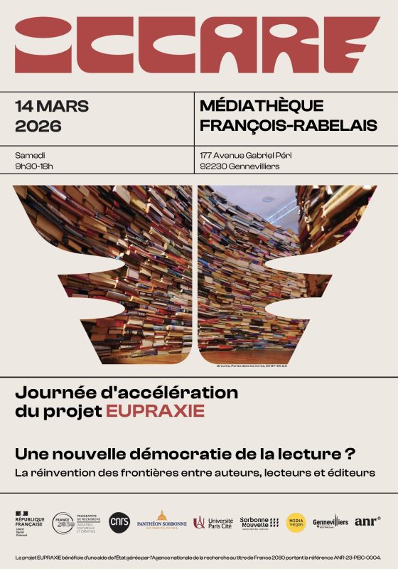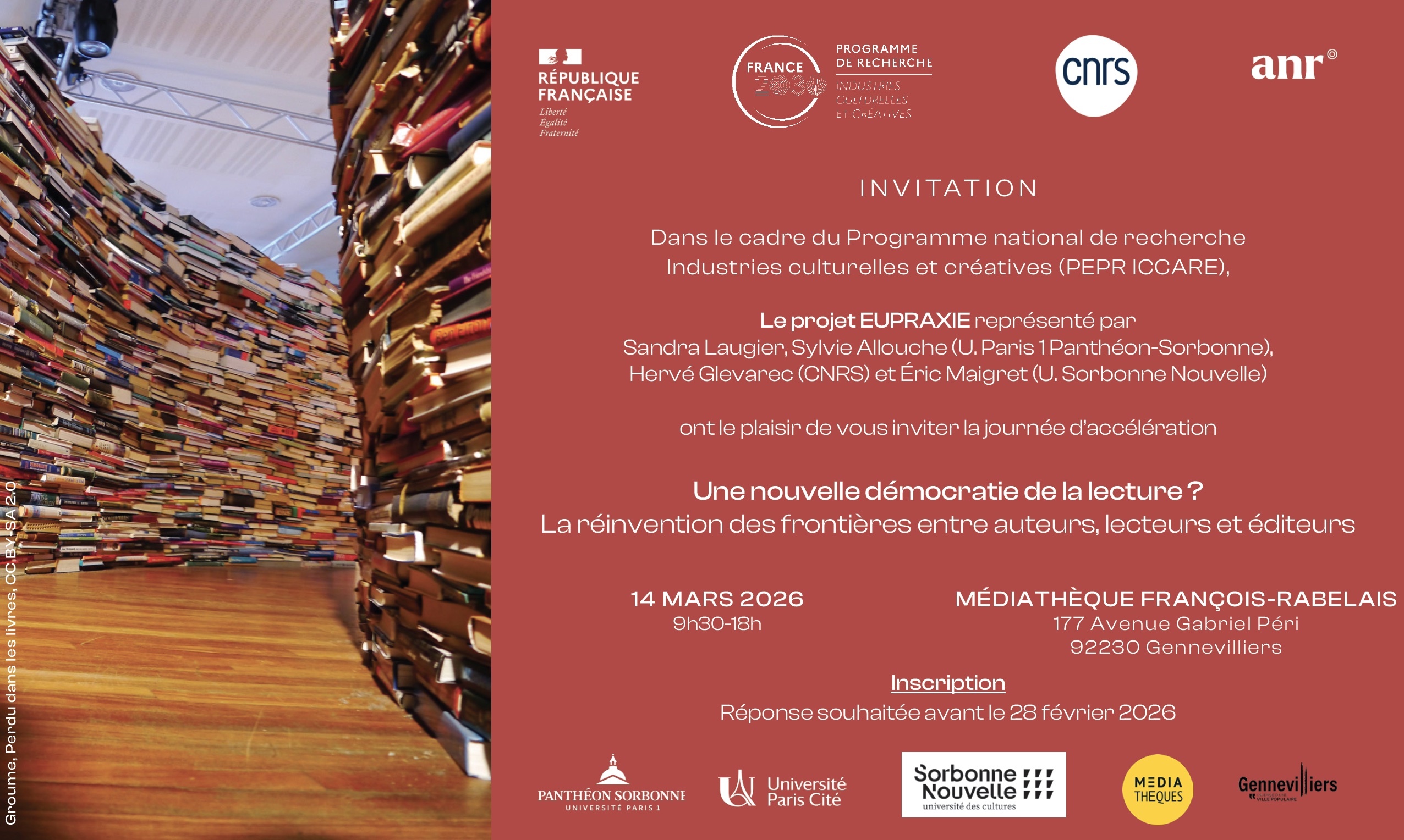 Le projet ciblé EUPRAXIE du programme de recherche (PEPR ICCARE) représenté par Sandra Laugier, Sylvie Allouche (Université Paris 1 Panthéon-Sorbonne), Hervé Glevarec (CNRS) et Éric Maigret (Université Sorbonne Nouvelle), organise le 14 mars 2026, une journée d'accélération "Une nouvelle démocratie de la lecture ? La réinvention des frontières entre auteurs, lecteurs et éditeurs", à la Médiathèque François-Rabelais de Gennevilliers (177 Avenue Gabriel Péri, 92230) — 9h30 à 18h.