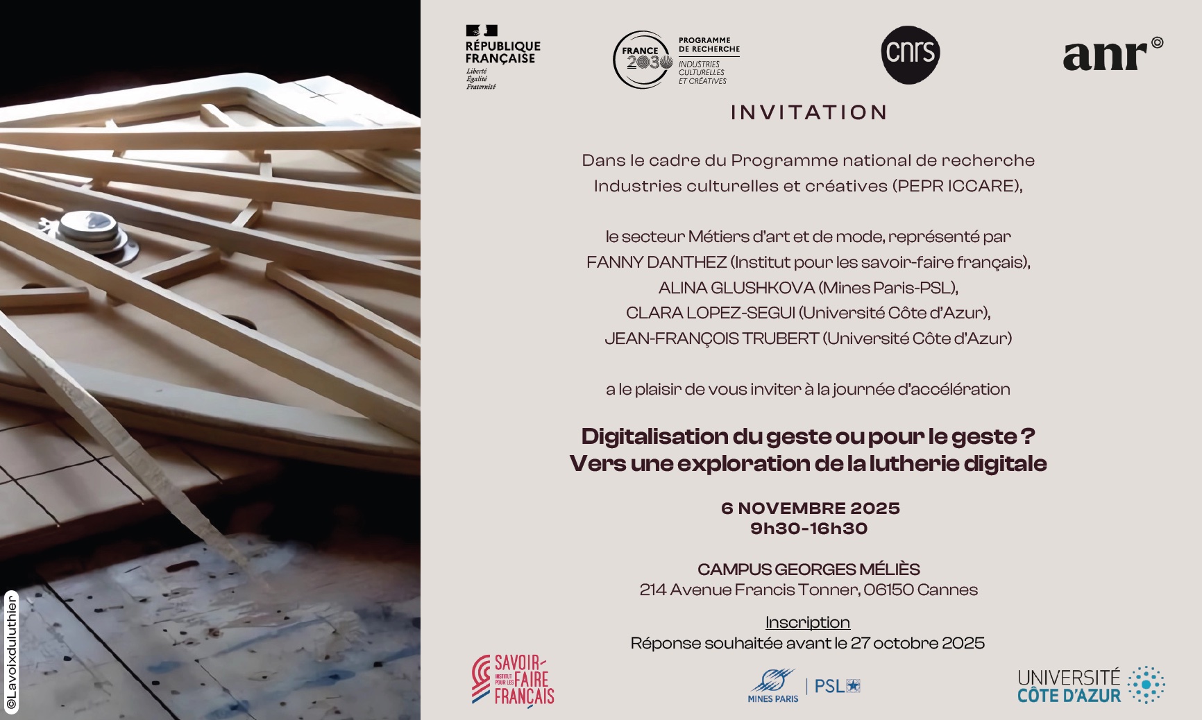 Avec FLORIAN GOURIO (Organisateur des Journées Nationales de Musiques Électroacoustiques), JOHANNE DENLEUX (Institut national des métiers d’art), CLARA LOPEZ SEGUI, JEAN-FRANÇOIS TRUBERT (Université Côte d’Azur), secteur Métiers d’art et de mode