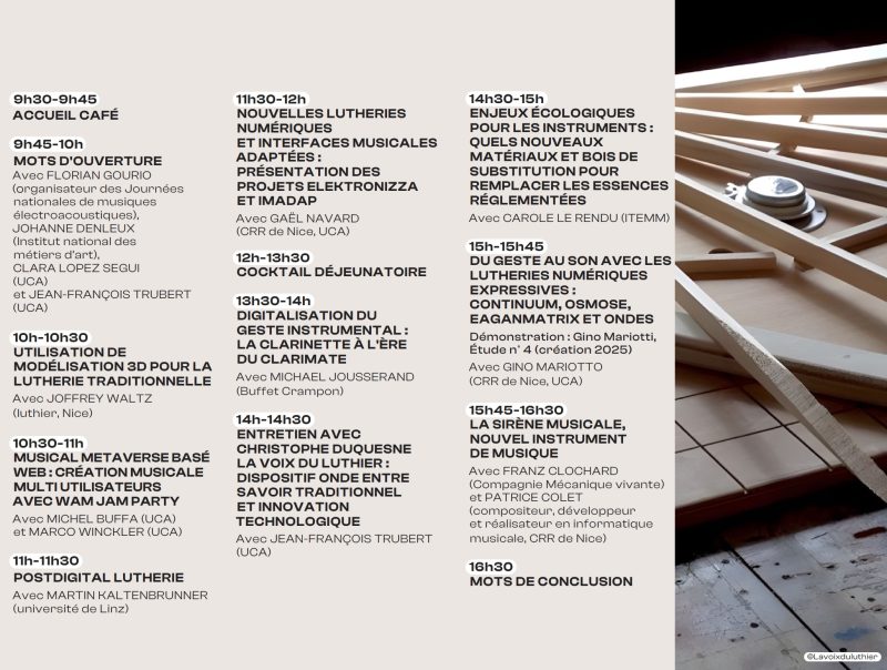 Cette journée d’accélération du secteur « métiers d’art » du programme de recherche ICCARE propose un aperçu de différentes expériences et conceptions ayant pour point commun d’exploiter les techniques numériques dans le domaine de la production sonore. Entre mécaniques fantaisistes, lutherie « augmentée » et élaboration de nouveaux dispositifs haptiques, entre savoir-faire traditionnels et nouveaux modes de jeu électronique, cette journée dédiée à la lutherie « digitale » et à la digitalisation de la lutherie nous invite, en association avec les Journées Nationales de la Musique Électroacoustique, à un instantané des derniers développements dans le domaine.