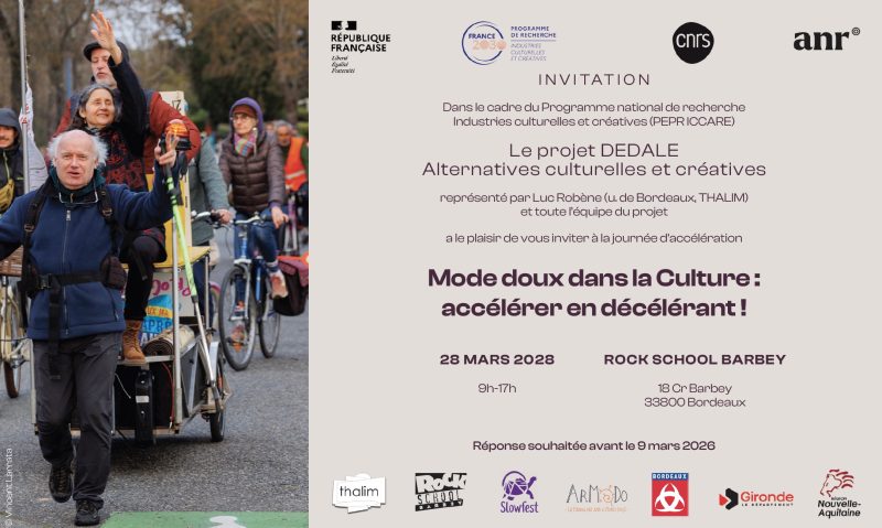 Comment passer d'expérimentations marginalisées à des transformations structurelles du secteur ? Cette journée DÉDALE croise les regards d'artistes, chercheurs, élus, militants et acteurs institutionnels pour imaginer collectivement les leviers d'une transformation écologique. La journée se clôturera par un spectacle à mode doux.