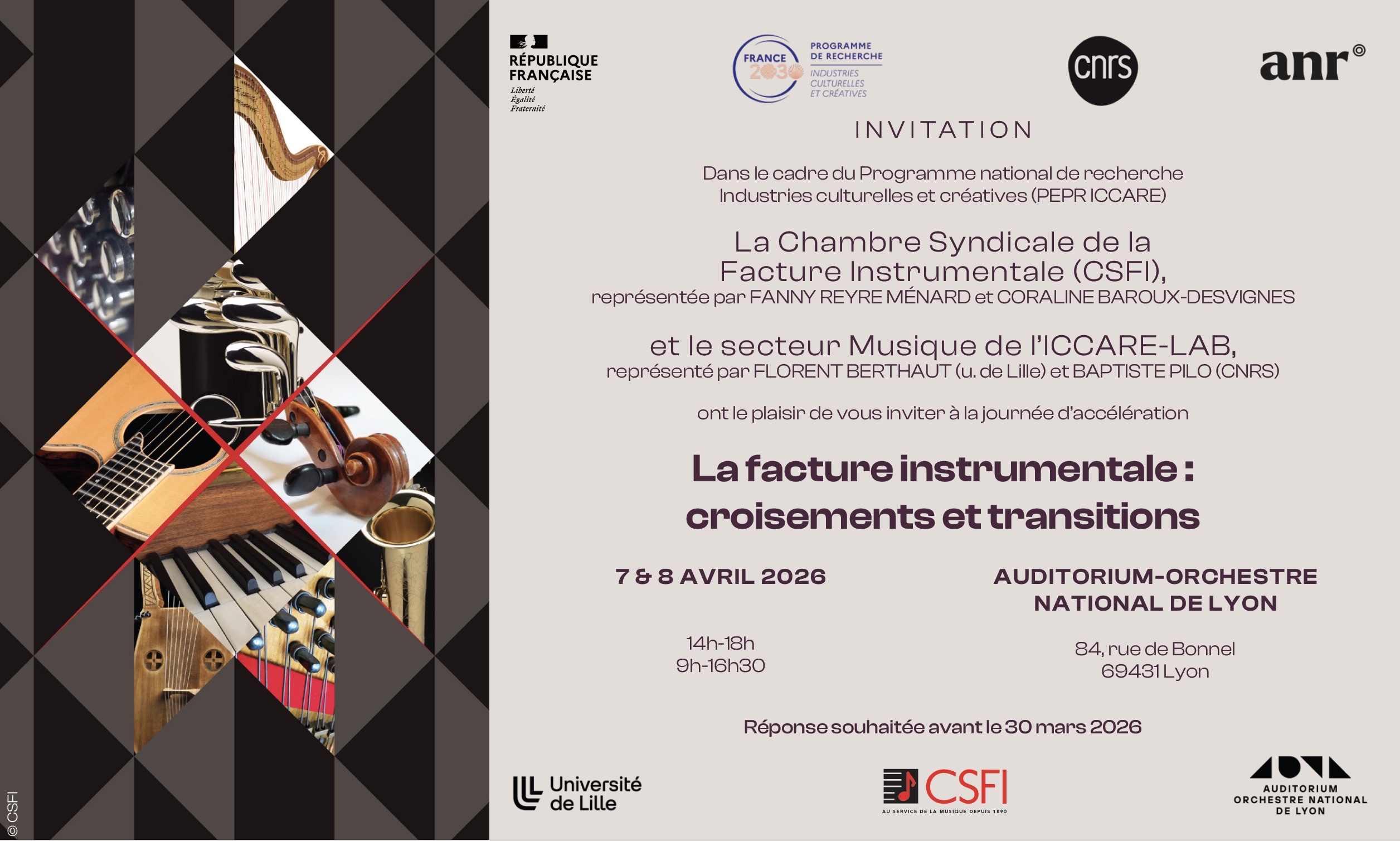 La Chambre Syndicale de la Facture Instrumentale (CSFI) et le secteur Musique de l’ICCARE-Lab du programme de recherche Industries Culturelles et Créatives (PEPR ICCARE) organisent, les 7 et 8 avril prochains à l’auditorium de l’Orchestre national de Lyon, deux journées dédiées aux échanges autour de la facture instrumentale.