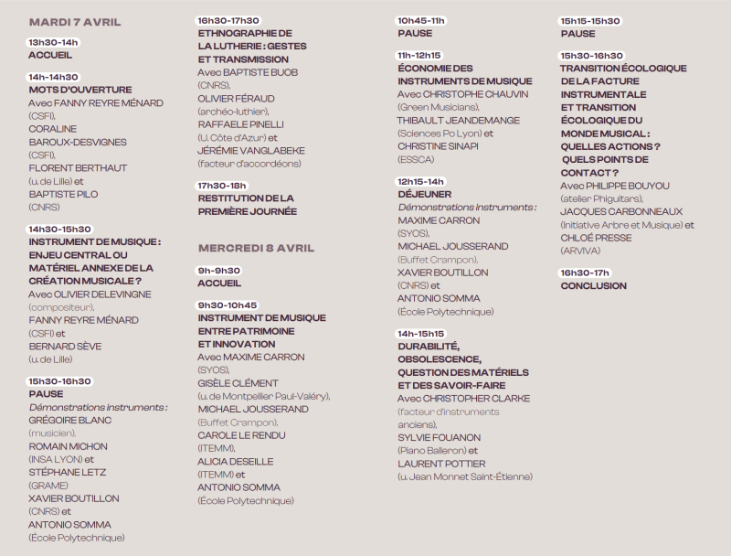 Pour chaque thématique, l’objectif est de confronter les points de vue et expérience d’universitaires, d’artistes et de professionnels de la facture instrumentale. Les sessions seront complétées par des démonstrations d’instruments.