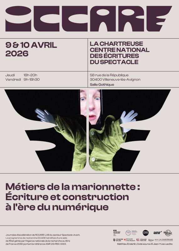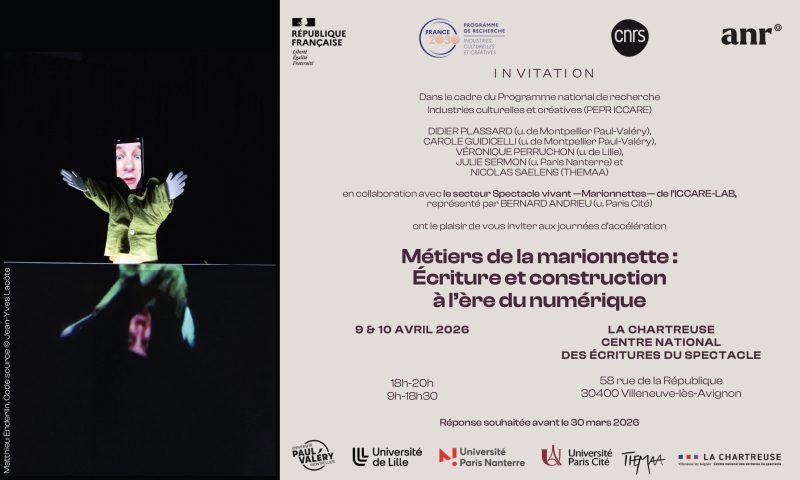 Longtemps marqués par leur attachement à l’artisanat théâtral, les métiers de la marionnette sont aujourd’hui traversés par des mutations tant artistiques qu’organisationnelles. Gestes, matériaux, écritures et imaginaires ne sont pas seulement redéfinis par l’irruption des outils numériques et les nouveaux défis sociétaux : ce sont les parts respectives de la dramaturgie et de la construction plastique qui, dans un art où l’innovation passe souvent par l’image, s’organisent en configurations inédites. S’inscrivant dans le prolongement du projet ERC PuppetPlays, en concertation avec l’association nationale THEMAA, les fédérations régionales FAMO, POLEM, AURA et le Centre National des Écritures du Spectacle, cette journée d’accélération du programme ICCARE propose de réfléchir à ces évolutions en associant chercheurs et monde professionnel.