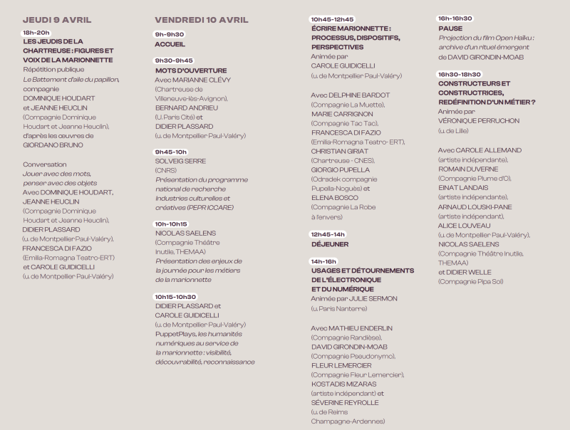 - Bien que sa place dans le processus de création du spectacle commence aujourd’hui d’être mise en lumière, l’activité de construction de marionnettes reste mal définie et n’est toujours pas reconnue comme un métier à part entière. Cette troisième table ronde prendra appui sur les réponses à un questionnaire réalisé par Alice Louveau, étudiante en Master Théâtre et spectacle vivant à l’Université de Montpellier Paul-Valéry, et relayé par THEMAA. Elle donnera la parole aux constructeurs et constructrices fabricants de marionnettes pour la scène et l’écran afin d’interroger leur rôle dans la création artistique. Elle permettra également de dresser un état des lieux des besoins de la profession en matière de reconnaissance institutionnelle ou de formation, et de réfléchir sur ses évolutions actuelles.