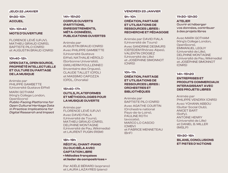 Ces journées seront à la fois l’occasion de mettre en lumière des projets intégrant une forte dimension open-data ou open-source, et de discuter collectivement des solutions techniques, juridiques et économiques pour renforcer la circulation et la valorisation des savoirs et des œuvres musicales dans un cadre propice à l’innovation et à la mutualisation.